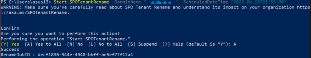 - Start-SPOTenantRename -DomainName “ABILlimited” -ScheduledDateTime “2022-04-26T21:58:00”