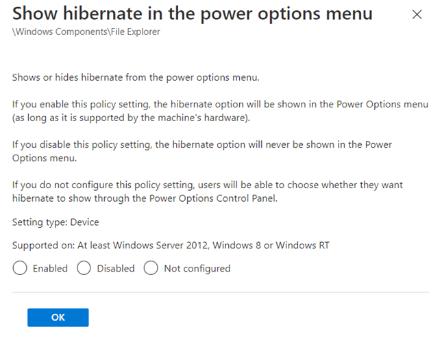 If you don’t see hibernate and you want to enable or disable this option across all the Windows devices in your IT Network then this is how you can push it across multiple devices using Intune.