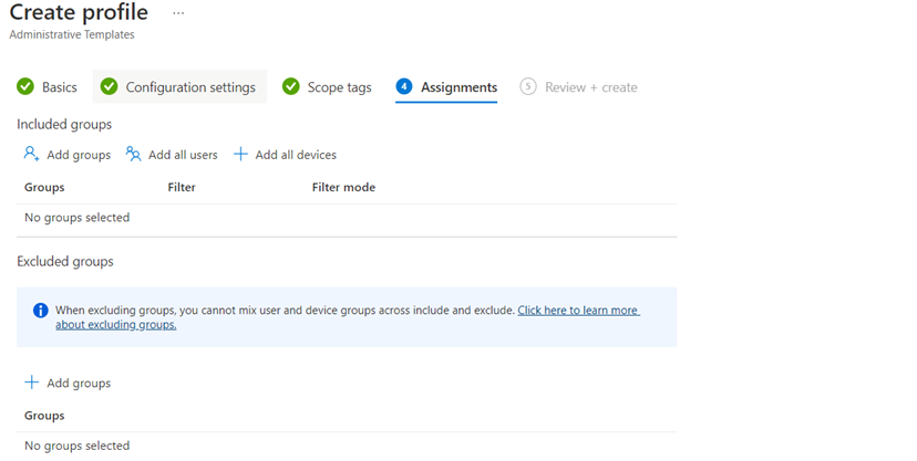 If you want to add tags, add them in the next “Scope Tags” section. To review the changes you have made or the options you have selected, go to the next step which is “Review + Create.