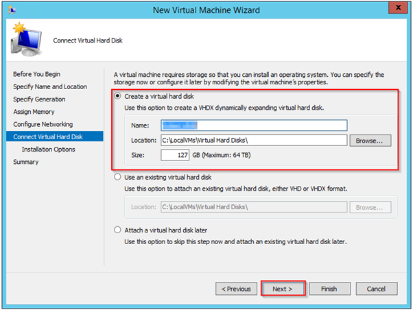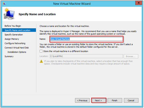 you first need to specify the name of the virtual machine. After selecting a name, you have the option to change where the virtual machine’s files are placed. By default, the location is not selectable and is already targeted to the host’s default virtual machine storage location.