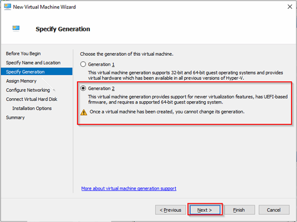 On the next screen, you’ll be asked to choose the Generation of the virtual machine. Each generation has its own set of features and capabilities, and the choice of which generation to use depends on the specific requirements of the virtual machine.