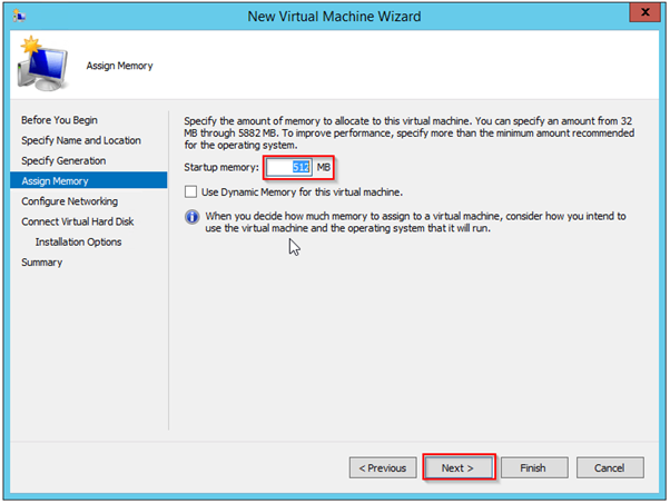 On the next screen, you set the preliminary memory settings for the virtual machine. use a value for the startup memory that is reasonable for the guest’s running purposes.