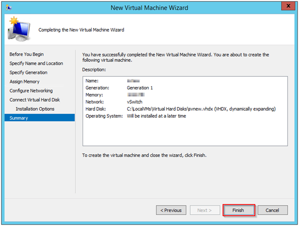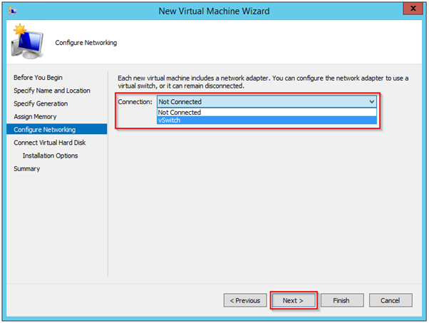 After setting the initial memory configuration, the next screen is Configure Networking. a single virtual network adapter will be automatically created. The only option you have here is to connect it to a virtual switch. And click on next.