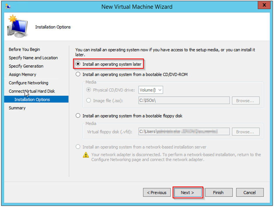 On the next screen, click on the installation option, Select Install an operating system later. And click on ‘ next’ option. After creating the VM, you can then use an installation media such as an ISO file or DVD to install the operating system on the VM. You can either connect the ISO file to the virtual DVD drive of the VM or you can use a physical DVD.