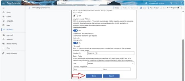 Here we will be increasing the number of items the action can get from SharePoint by turning on Pagination and increasing the threshold.