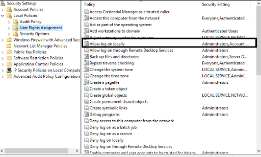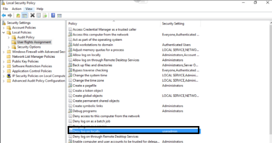 1. Expand to Security Settings > Local Policies > User Rights Assignment. In the right pane, locate the policy named Deny log on locally. Double-click on it to modify.