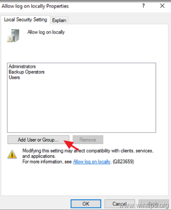 5. At the ‘Allow log on locally Properties’ window, click on Add User or Group.